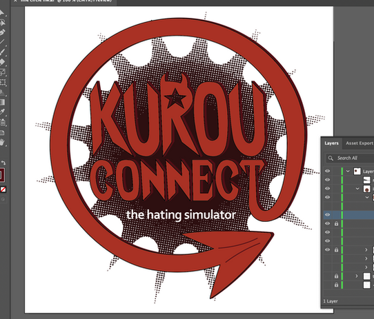 first, i decided to ideate the game's logo as that would set the stage for the rest of the interface. i wanted the logo to feature kurou's little devil tail, as that's one of his defining features, and i wanted the general color palette of it to be red, since that's the color of his skin. i wanted it to be circular in nature to imply the cyclical loop of the gameplay and to draw on the idea of connection. the font was hand-created by me, meant to evoke kurou's sharp and pointy personality and his role in artemis' pop punk/punk rock garage band.