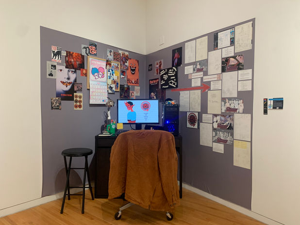 the demo of kurou connect was completed on april 8, 2024. on april 10, 2024, the game was debuted not only online but also at my solo thesis show. since my work is exclusively digital, i had to figure out a way to bring it to life and make my professors, peers, and passersby understand the great amount of work that's required to make a video game. i inevitably decided that i was going to create an installation that not only replicated a space that's within kurou's room in the game, but also provide images of my process and inspiration to give people the full story upon seeing the work.