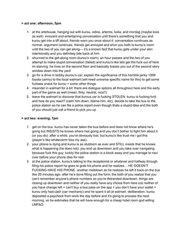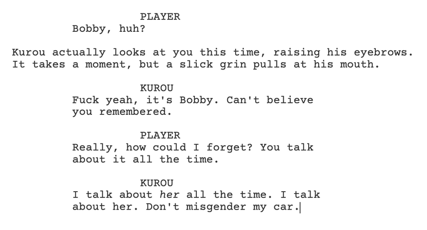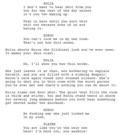 the next step was to develop the outline of what i was going to write for this build. i initially wrote an outline that specifically detailed all of the events i talked to kye about in 2022, but not only would it have been incredibly difficult to write in four months, it was also hard to piece together. i then wrote a second outline that was more succinct. it was after this that i chose to write just the first act, rather than the wrote true ending. this way, i could focus on making the game well-crafted in every sense, not sacrificing one element for another. additionally, the first act would leave a very good drop-off point for the demo, allowing players to explore the world and their dynamic with kurou, then amp up the anticipation after something shocking happens at the end of the playthrough.