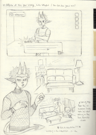 with the script being completed, it checked off about 50% of the game's development. what needed to be done now was the visuals. i picked sketching in a sketchbook back up in this semester, something i hadn't had the time or energy to do for the past several years, and i spent a significant amount of time using my sketches as a way to think about what sort of visuals the game required, both in user interface and character art. i additionally used my sketchbook to write notes about specific aspects of the game, such as the music, sound effects, and backgrounds, as well as using it as a checklist and reflection space. this proved to be extremely effective. i was able to think about other facets of the game while simultaneously working on the script, allowing me to create succinctly blend everything together.