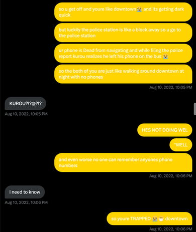 this game had mentally been in development for years prior to its physical form. on august 10th, 2022, i had a conversation in twitter dms with my friend kye about a theoretical game i wanted to create about kurou hasegawa, a side character within cryptid coffeehouse. it was intended to be a "be forced to spend a day with kurou" type of game, and the work hasn't strayed far from that idea at all.